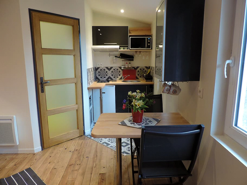 Il est constitué d’un coin cuisine et salle à manger avec une kitchenette équipée.