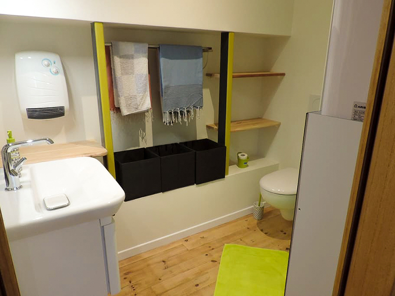 lit (160x200), commode en carton, fer à repasser, portant pour sécher le linge, portant avec cintres, lavabo, douche à l’italienne, linge de maison, étagères en bois brut