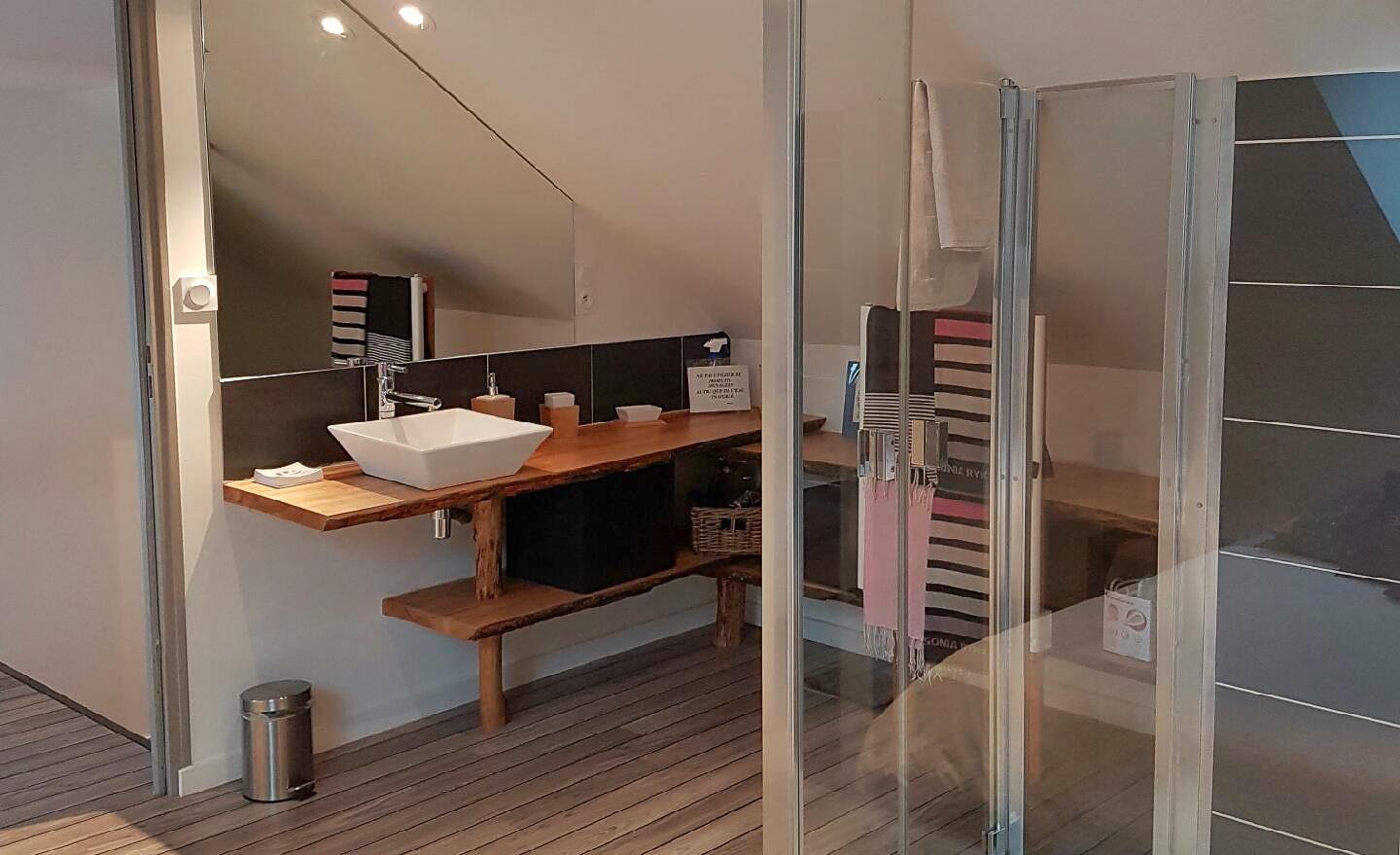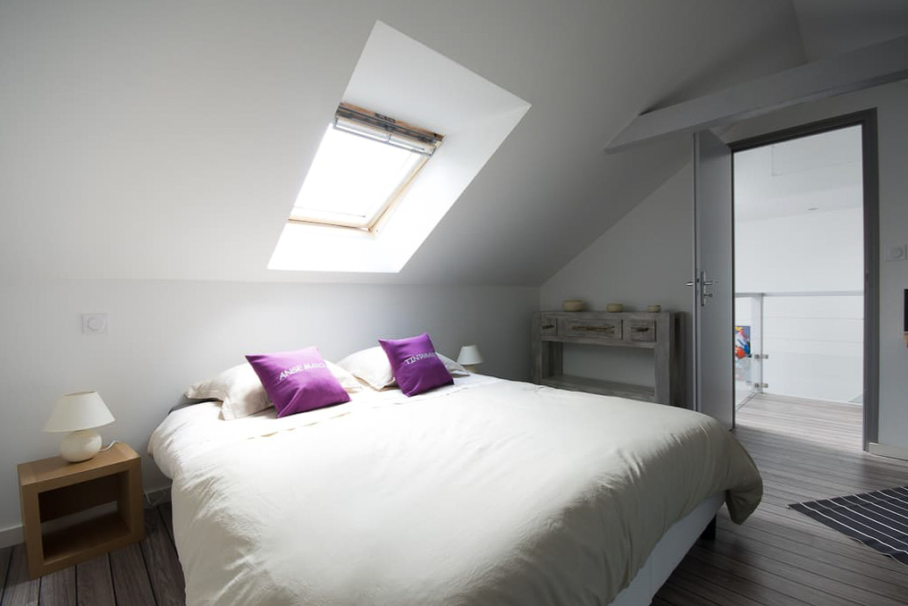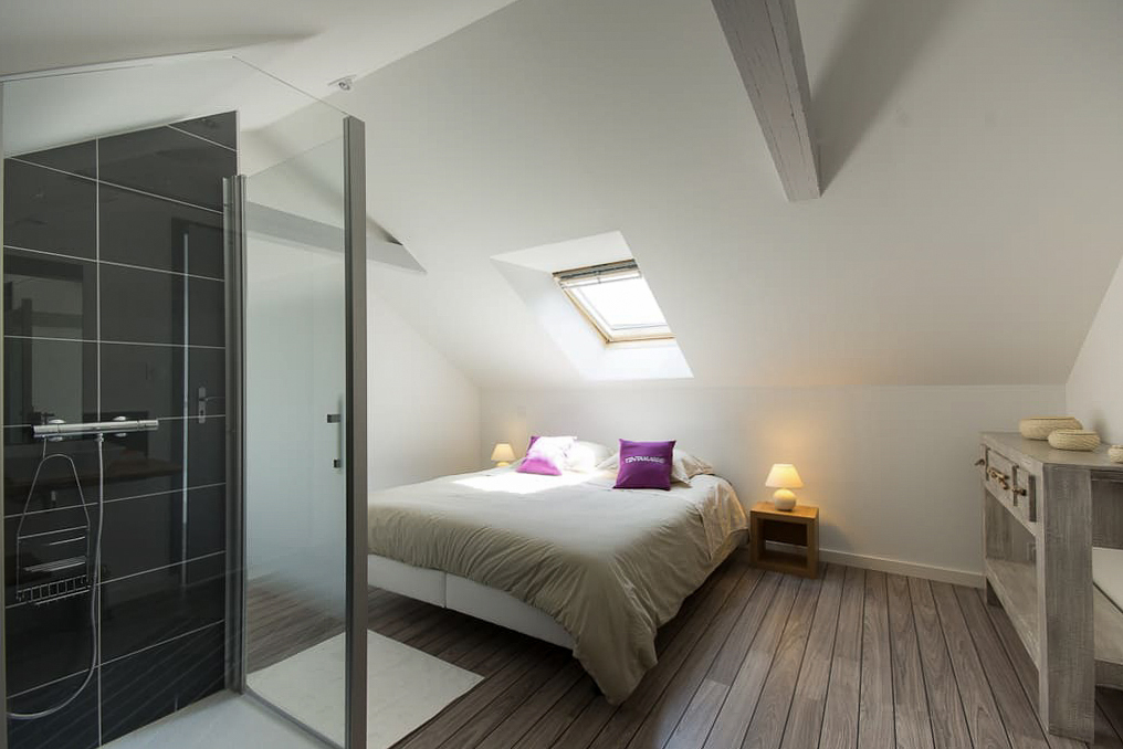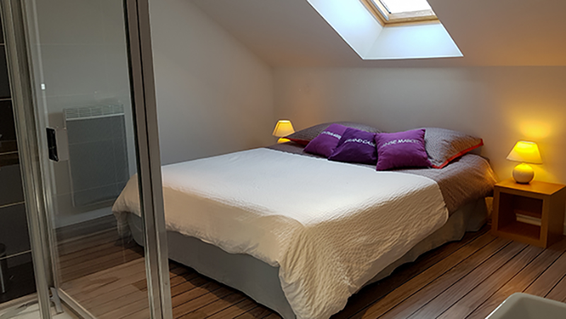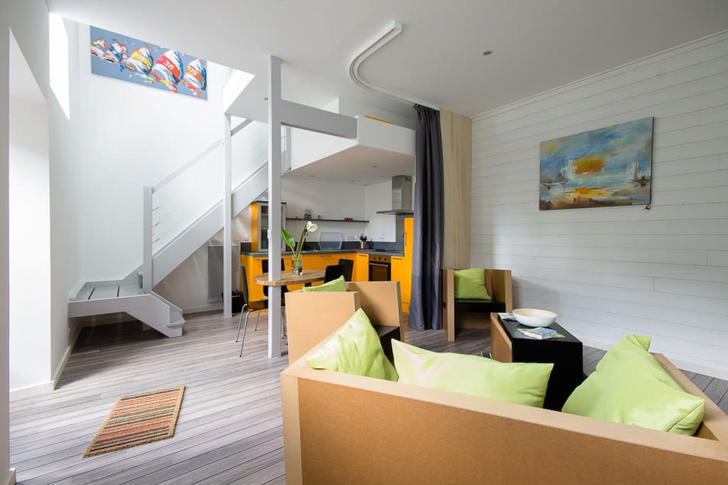 Le duplex peut accueillir 4 personnes (deux couples). Il est composé d’un chambre à l’étage avec une salle de bain ouverte et une douche à l’italienne. La cuisine à l’américaine au design moderne donne sur le salon qui peut être aménagé en chambre d’appoint grâce à un jeu de cloisons amovibles et un lit de 160x200 intégré dans le mur. Sur le palier, vous trouverez un WC et un lave main.