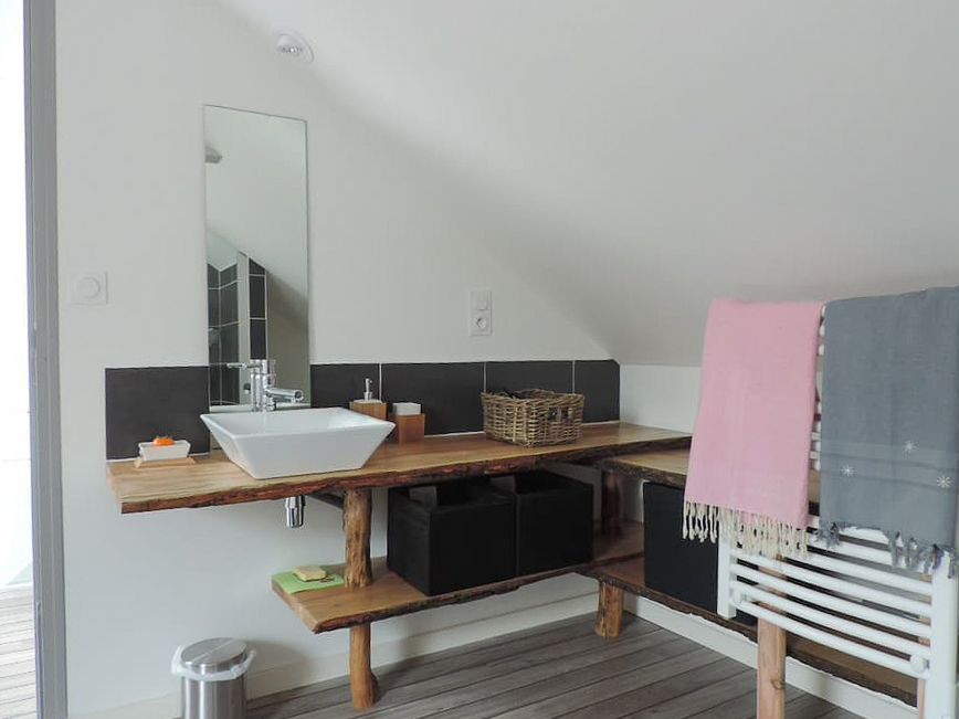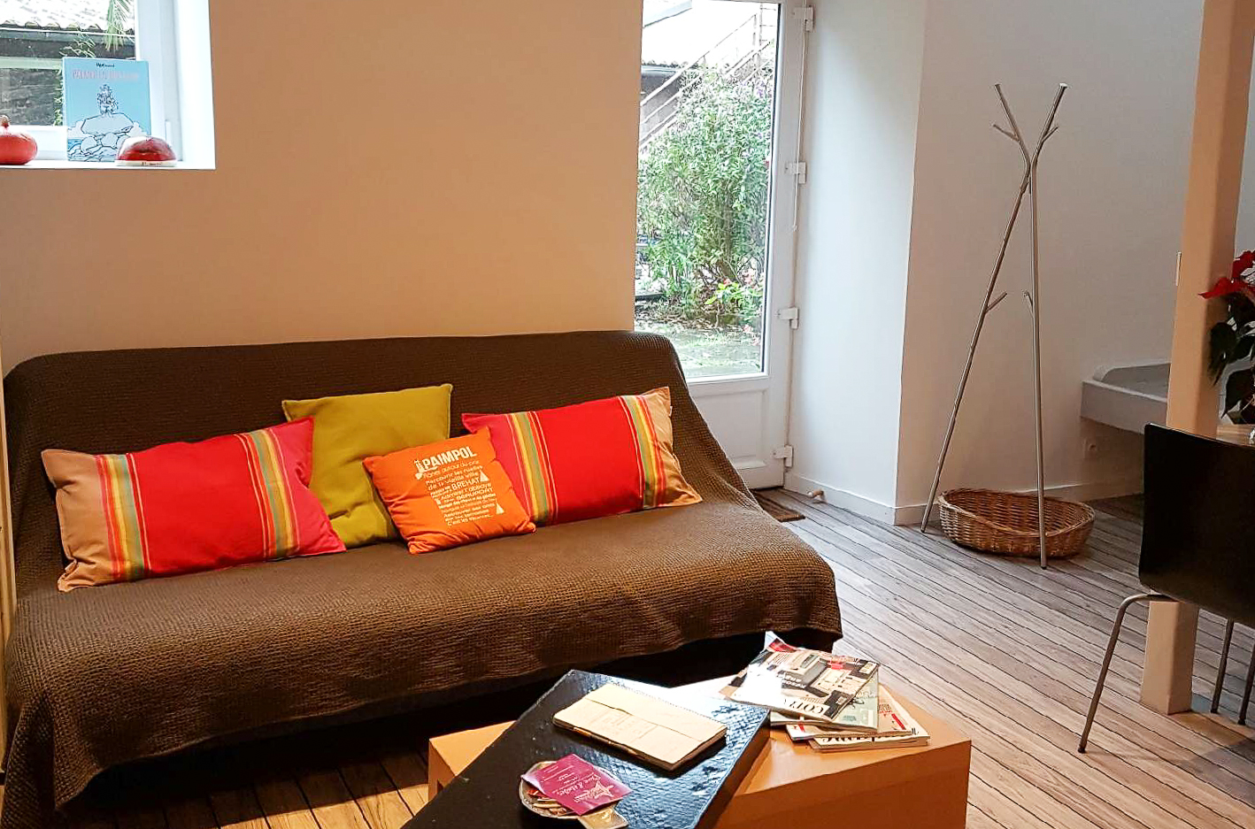 À l’entrée, dans le salon d’été, vous trouverez une table d’accueil avec des cartes de visite de nos restaurants préférés et les activités sympas à Paimpol.