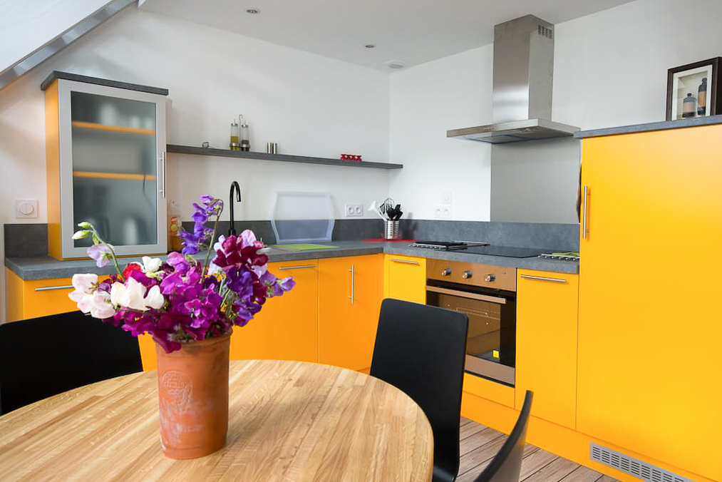 vaisselle, micro-ondes, réfrigérateur, plaques vitrocéramiques, hotte, évier, rangements, linge de maison (torchons), table + 2 chaises, produits d’entretien écologiques