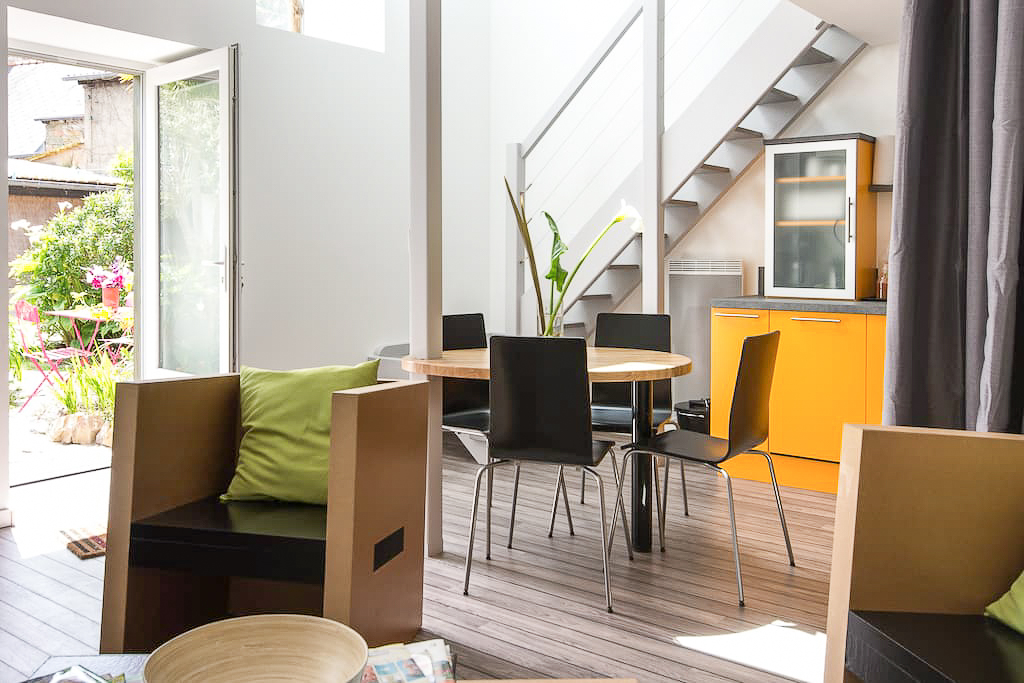 Le cocon écologique est un duplex indépendant moderne et design dans son écrin de verdure. L’intérieur est très lumineux et le mobilier est en partie réalisé à base de carton.