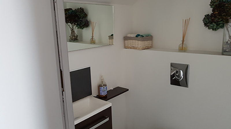 Une salle de bain séparée dispose d’un lavabo, un WC, une douche et de nombreux rangements. Le coin chambre est spacieux et chaleureux avec une literie récente pour un couple. Un petit coin repos à été aménagé.